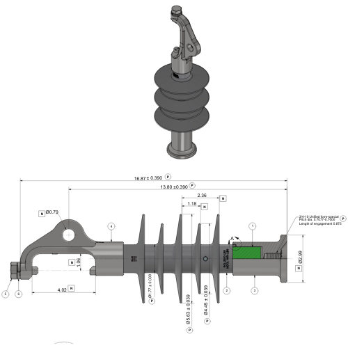- 28kV ANSI Class 51-22 Composite Line Post Insulator with HTV silicone housing, horizontal clamp top and stud base end fittings.