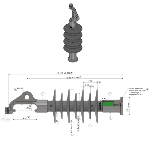 - 35kV ANSI Class 51-23 Composite Line Post Insulator with HTV silicone housing, horizontal clamp top and stud base end fittings.