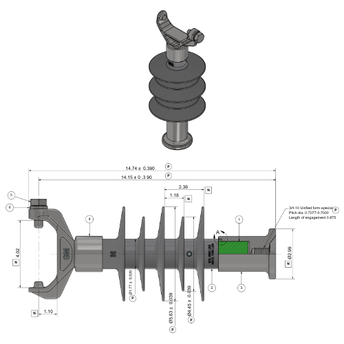- 28kV ANSI Class 51-12 Composite Line Post Insulator with HTV silicone housing, vertical clamp top and stud base end fittings.