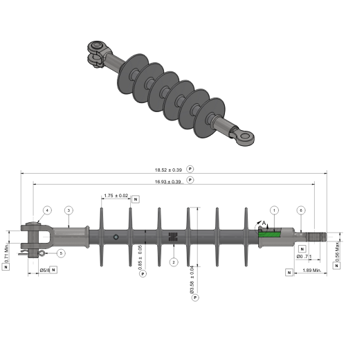 - ANSI Class DS-28 Composite Suspension/Deadend Insulator with HTV silicone housing and clevis-tongue end fittings.