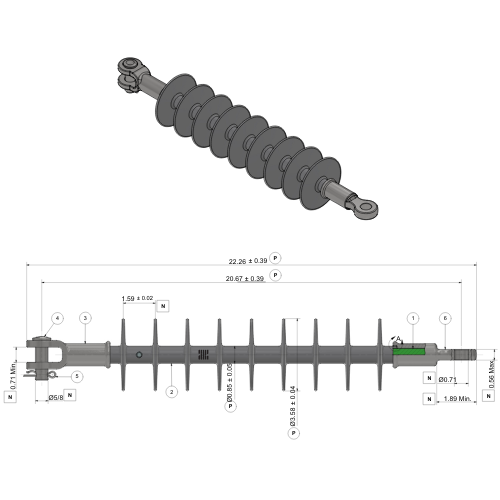 - ANSI Class DS-35 Composite Suspension/Deadend Insulator with HTV silicone housing and clevis-tongue end fittings.