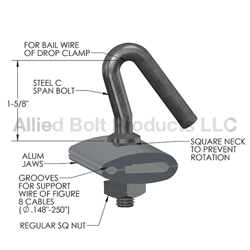 • Clamp is comprised of a specially shaped bolt, two aluminum jaws, and a square nut.