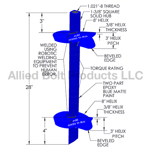 3493 8" TWIN SOLID SQUARE HUB HELIX POWER DRIVEN ANCHOR 1-3/8" HUB - 6000 FT. LB. FOR 3/4" AND 1" RODS 1 1 29