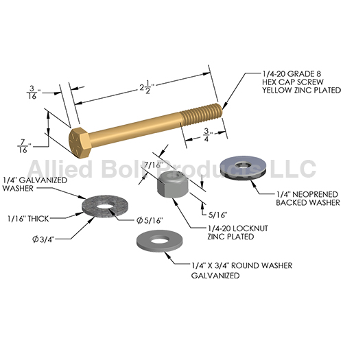 - Kits Contain (1) 1/4"-20 X 2-1/2" Hex Cap Screw GR-8 Steel Zinc Yellow, (1) 1/4" Neoprene Backed Washer, (1) USS Flat Washer Zinc Plated, (1) 1/4" X 3/4" Round Washer Galvanized, and (1) Finished Hex Lock Nut Grade 2 Zinc Plated.