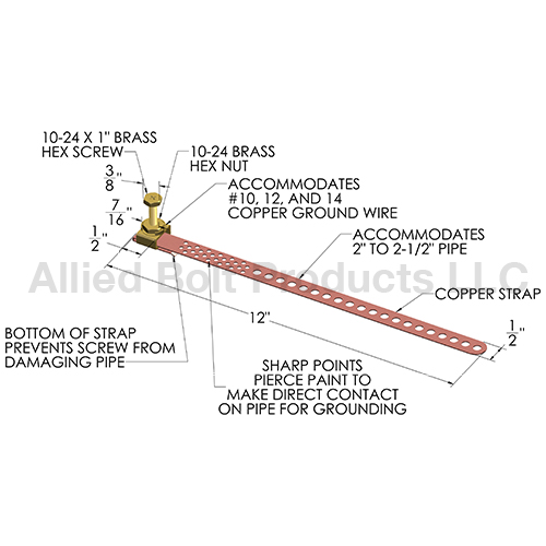 • Provides a permanent connection between a copper water pipe or power service mast and a #14 to #10 AWG ground wire.