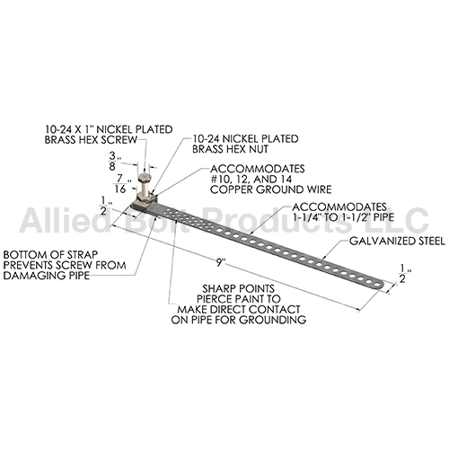 • Provides a permanent connection between a copper water pipe or power service mast and a #14 to #10 AWG ground wire.