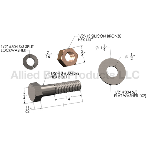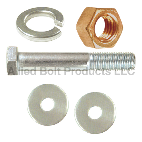 - Kits contain one 304 Stainless Steel Hex Cap Screw, two 304 Stainless Steel Flat Washers, one 304 Stainless Steel Split Lock Washer, and one Silicon Bronze Nut.