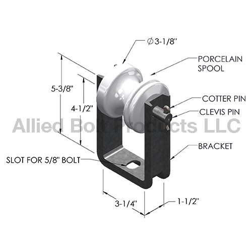 • Consists of a Porcelain Spool Insulator mounted in a ‘U’ shaped channel bracket with a 5/16” Steel pin and cotter pin.