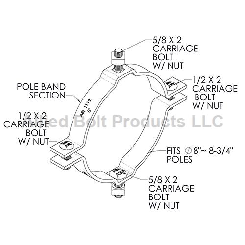 • Each Pole Band Assembly contains two 1/4" x 1-1/2" stamped brackets, two 1/2" x 2" Carriage Bolts with Regular Square Nuts for clamping brackets together, and two 5/8" x 2" Carriage Bolts with Regular Square Nuts for attaching racks.