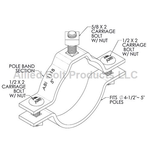 • Each Pole Band Assembly contains two 1/4" x 1-1/2" stamped brackets, two 1/2" x 2" Carriage Bolts with Regular Square Nuts for clamping brackets together, and one 5/8" x 2" Carriage Bolt with Regular Square Nut for attaching racks.