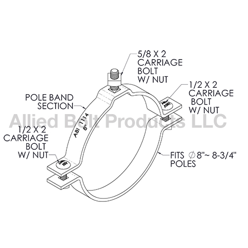 • Each Pole Band Assembly contains two 1/4" x 1-1/2" stamped brackets, two 1/2" x 2" Carriage Bolts with Regular Square Nuts for clamping brackets together, and one  5/8" x 2" Carriage Bolt with Regular Square Nut for attaching racks.