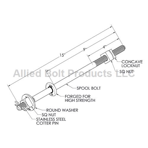 • Spool Bolts are equipped with a 5/8" Round Washer, 5/8" Regular Square Nut, and a Cotter Pin on one side.The other side is equipped with a 5/8" Concave Square Locknut and Regular Square Nut.