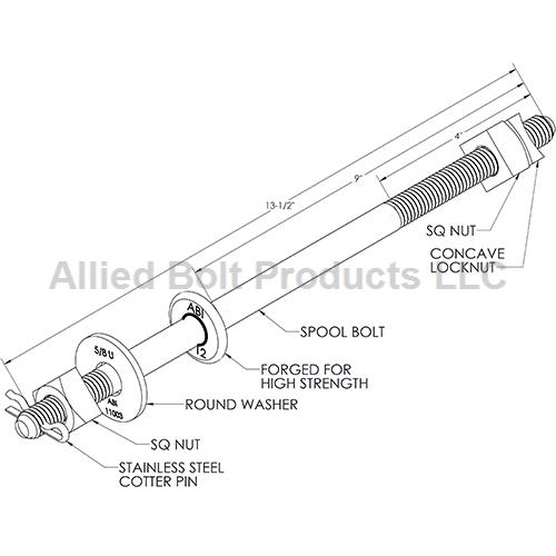 • Spool Bolts are equipped with a 5/8" Round Washer, 5/8" Regular Square Nut, and a Cotter Pin on one side.The other side is equipped with a 5/8" Concave Square Locknut and Regular Square Nut.
