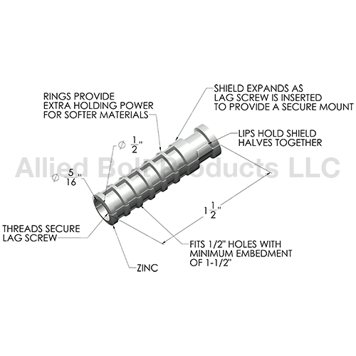 • Used in conjunction with lag screws for attaching cable clamps, terminals, lock boxes, etc. to concrete, hollow block, and brick.